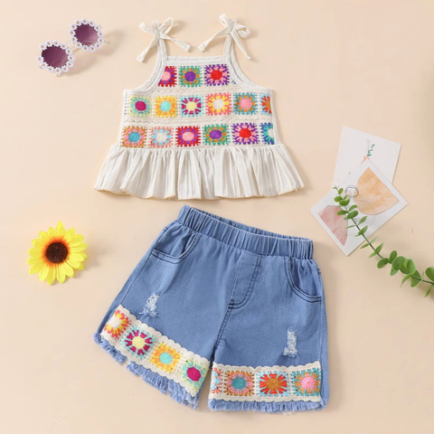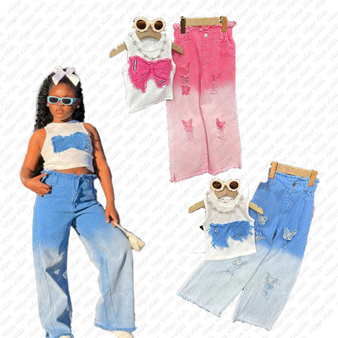 2025 Mùa Hè Trẻ Em Thể Thao Trang Phục Không Tay Bướm Vest Tie Dye Denim Ripped Quần 2Pcs Toddler Cô Gái Quần Áo